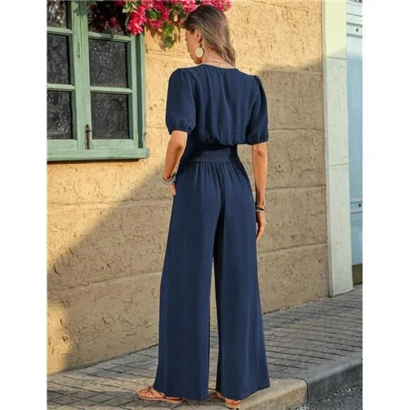 Womens Jumpsuits Short Sleeve V Neck Dark Blue