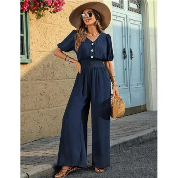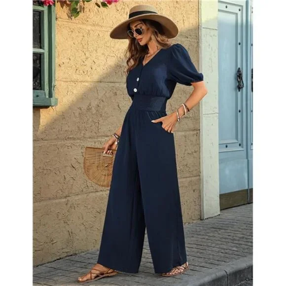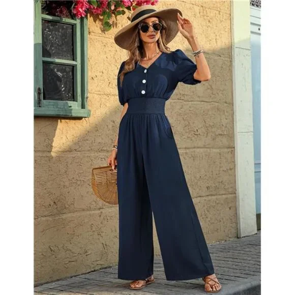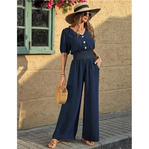 Lightweight and Comfortable: This women´s jumpsuit is made of high-quality fabrics, comfortable and breathable to wear; the elastic pleated design at the waist perfectly modifies the waist and is body-friendlyFeatures: one-piece design, V-neck, classic and fashionable shell buttons, short sleeves, solid color, elastic waist, classic wide-leg pants design, two pocketsOccasion: This summer casual jumpsuit is fashionable and elegant, and it is simple and fashionable to match. Just wear a sun hat, necklace, thin cardigan or sandals to create a summer beach style, or create a casual style, which is very suitable for daily wear, home, outdoor, shopping, dating, party, beach, street, school, travel, vacation, club, night out, etcClothing care: It is recommended to machine wash with a laundry bag, machine wash with clothes of the same color, do not bleach, hang to dry