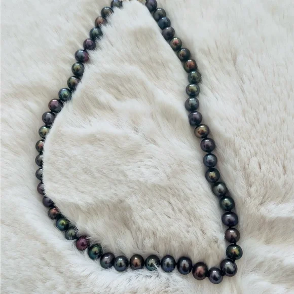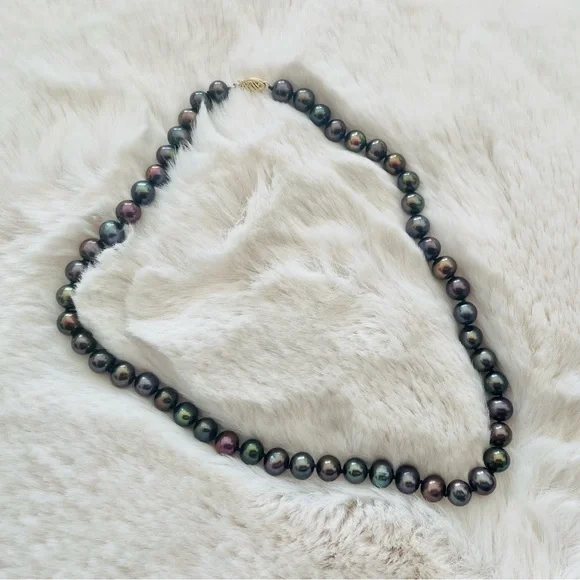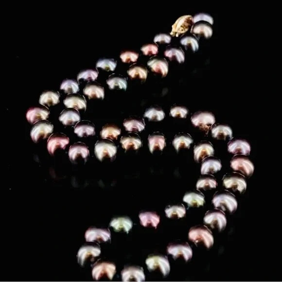 A rare colors of exquisite pearls ( near round to oval/8.00-9.10x 8.20mm)to be a classic piece of gem. 18” in Length/43.10 total weight in grams/14 K pearl clasp.