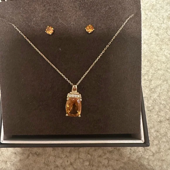 Golden topaz pendant necklace with diamond accents and stud earrings from Jared. Set in 14k gold. Necklace is 16” with 2” extension. Lobster clasp closure Beautiful set!