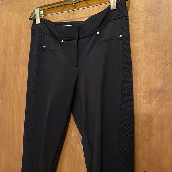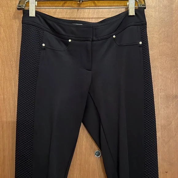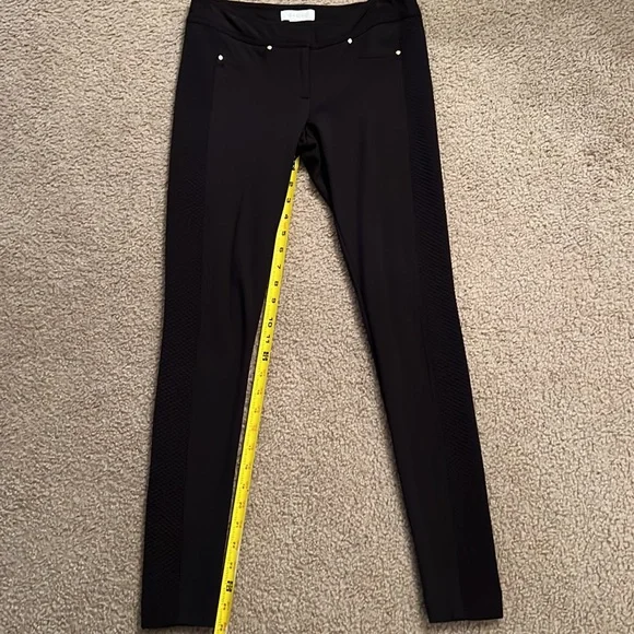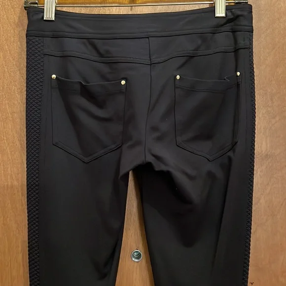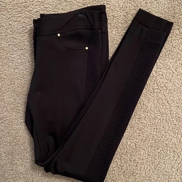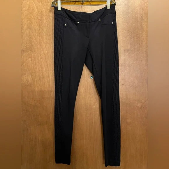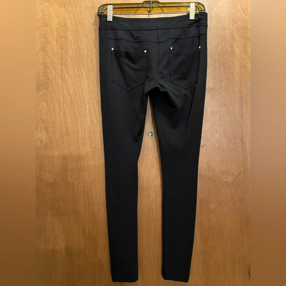 GORGEOUS! Pair of black skinny leg pants. Black diamond like design detailing down each side. Two fake front pockets with gold stud detailing and two back pockets. In excellent condition. Look brand new. Inseam approximately 26”.