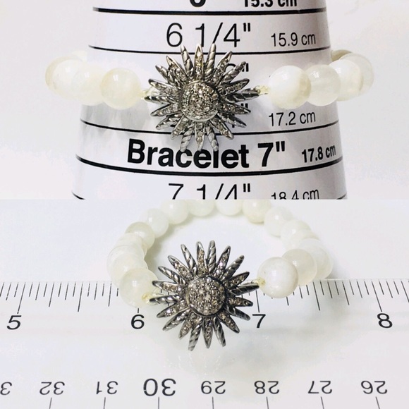 Designer Diamond Star Burst Bead BraceletSterling Silver Station White & Cream Agate Gemstone BeadsPave Set Diamond Gemstones One Size Fit Stretch Cord No Clasp Very Good Condition Light WearMetal & All Gemstones Tested & ConfirmedListing Images Are Of The Actual Item Being Offered