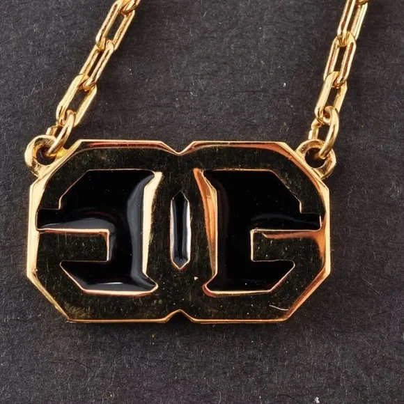 Givenchy gold tone double G logo pendant necklace filled in with black enamel. Pendant measures approximately 1 X 0.5” and is stamped & the chain measures approximately 15”. Spring clasp & hang tag. In excellent pre-owned condition.Please carefully review photos, read the description & ask questions PRIOR TO buying/bidding/offering. All sales are binding & final. No cancellations.