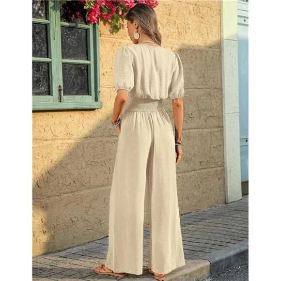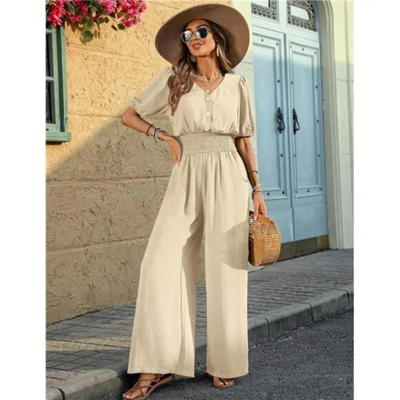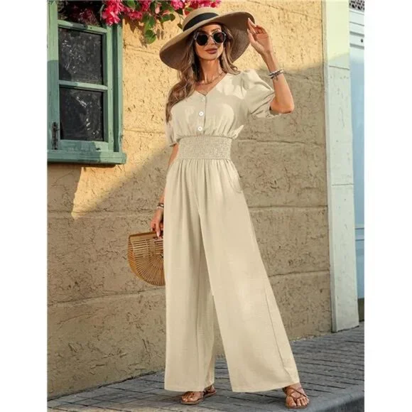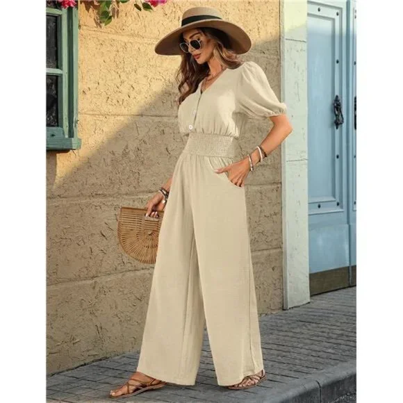 Lightweight and Comfortable: This women´s jumpsuit is made of high-quality fabrics, comfortable and breathable to wear; the elastic pleated design at the waist perfectly modifies the waist and is body-friendlyFeatures: one-piece design, V-neck, classic and fashionable shell buttons, short sleeves, solid color, elastic waist, classic wide-leg pants design, two pocketsOccasion: This summer casual jumpsuit is fashionable and elegant, and it is simple and fashionable to match. Just wear a sun hat, necklace, thin cardigan or sandals to create a summer beach style, or create a casual style, which is very suitable for daily wear, home, outdoor, shopping, dating, party, beach, street, school, travel, vacation, club, night out, etcClothing care: It is recommended to machine wash with a laundry bag, machine wash with clothes of the same color, do not bleach, hang to dry