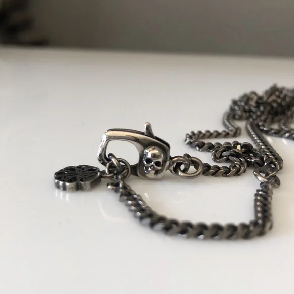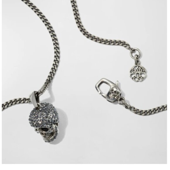 Alexander McQueen necklace with a crystal-embellished skull charmNecklace length: approx. 15 inchesBrass hardware with antique silver finishMade in Italy!! There are 2 versions of this Necklace - this is the larger one (pls see the last image to compareProduct measurements:Length when open 27.95 inPendant length 0.86 inPendant width 0.47 inWidth 0.11 in