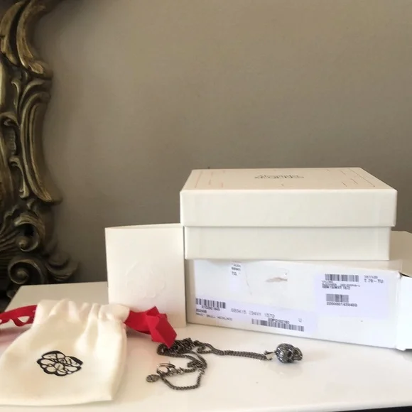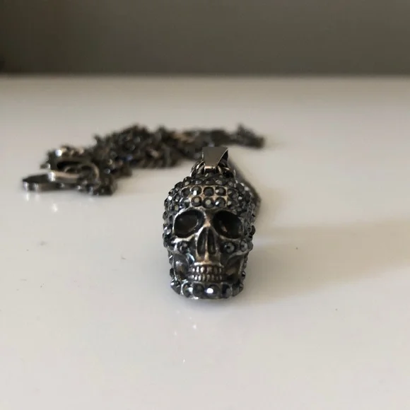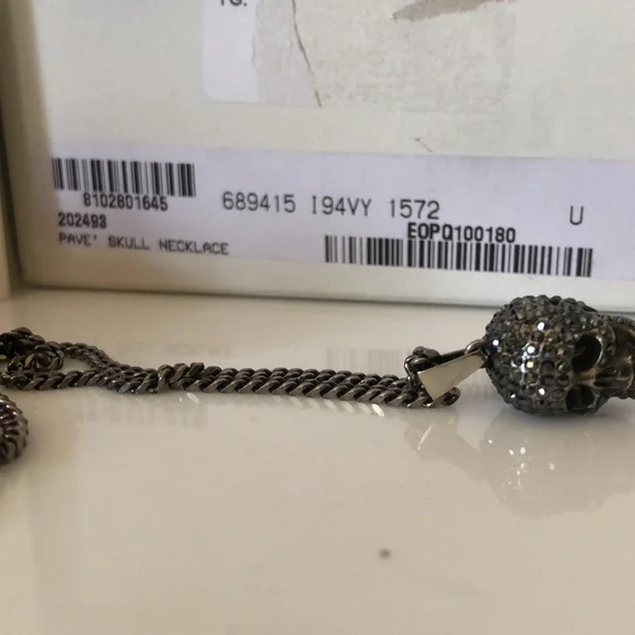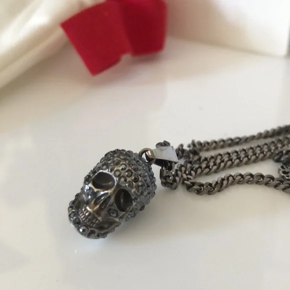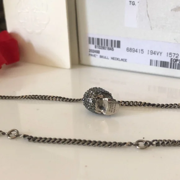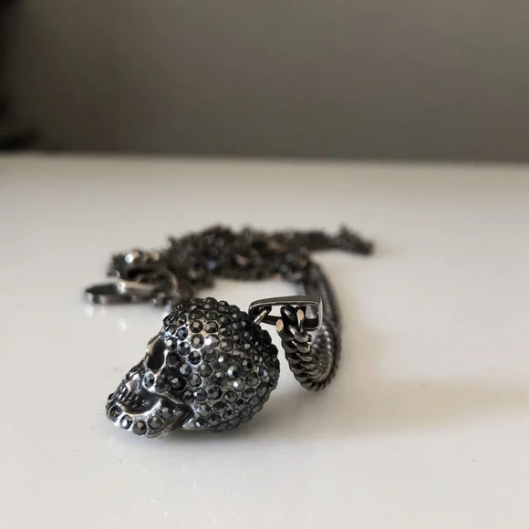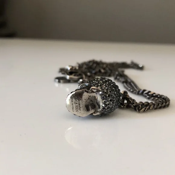 Alexander McQueen necklace with a crystal-embellished skull charmNecklace length: approx. 15 inchesBrass hardware with antique silver finishMade in Italy!! There are 2 versions of...