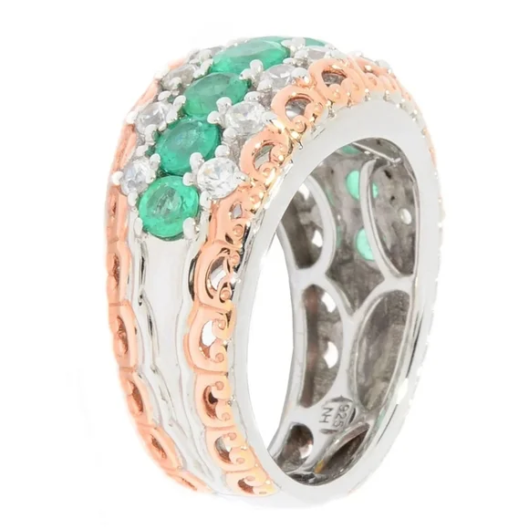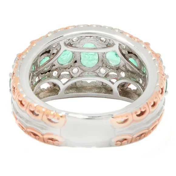 Absolutely enchanting genuine emeralds are set in palladium sterling silver with 18k rose gold framing around the edges. The emeralds are accented by sparkling white zircons. One oval 6x4mm and eight round 3-3.8mm emeralds and sixteen round 2mm white zircons. The total carat weight is 2.44. This ring was designed by Michael Valitutti for his Gems En Vogue collection. Size 8Stamped NH 925.About the Designer: Michael Valitutti designs jewelry under the brand Gems en Vogue, which features European-inspired pieces with genuine gemstones set in sterling palladium alloy and 18K gold. His jewelry is inspired by art movements like Art Deco and the French Renaissance. Valitutti has a graduate Gemologist diploma from the Gemological Institute of America (GIA)