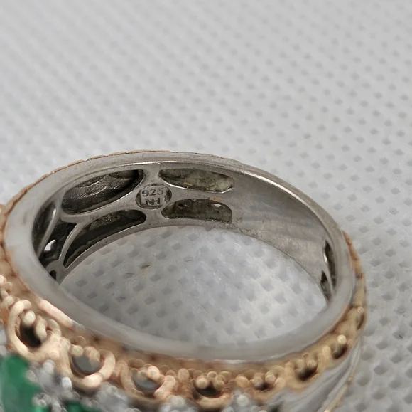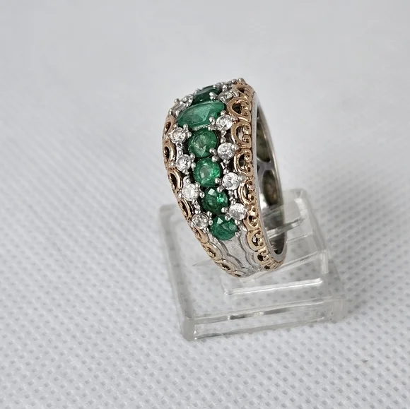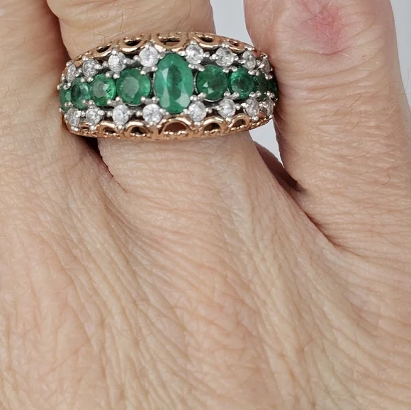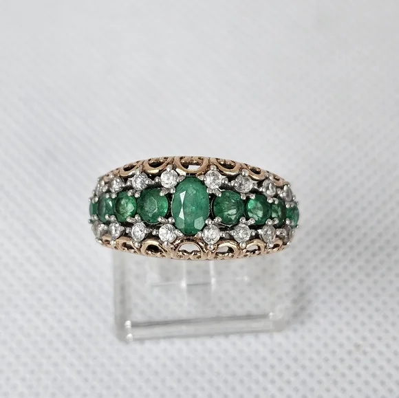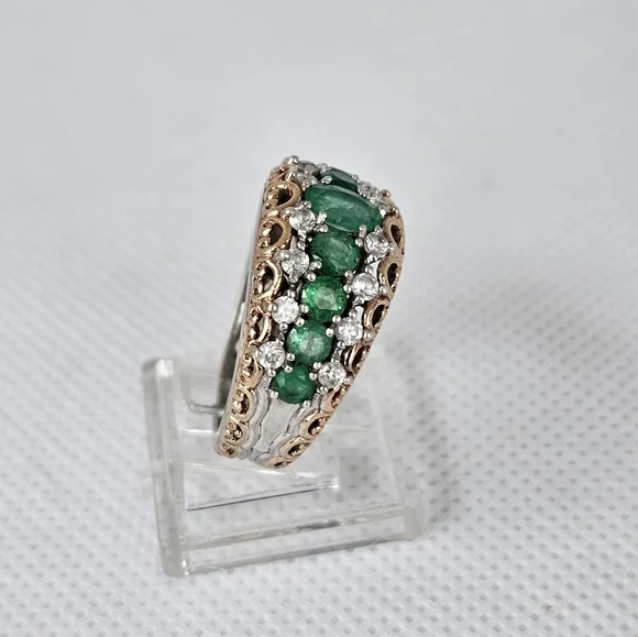 Absolutely enchanting genuine emeralds are set in palladium sterling silver with 18k rose gold framing around the edges. The emeralds are accented by sparkling white zircons. One...