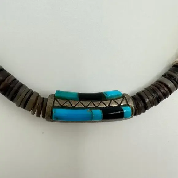 Excellent condition, sterling silver shows minor tarnishing. Made entirely by hand including every single bead, this lovely necklace features discs of shell and unmarked sterling silver hardware inlaid with genuine turquoise and onyx. Length is 14”. Clasp is sterling silver and functions perfectly.Tags: beads beaded beading