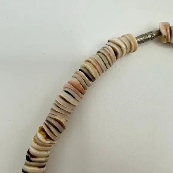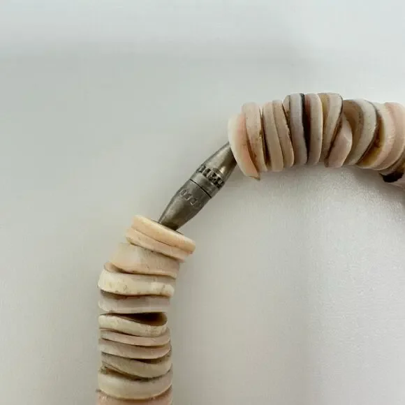 Excellent condition, sterling silver shows minor tarnishing. Made entirely by hand including every single bead, this lovely necklace features discs of shell and unmarked sterling...