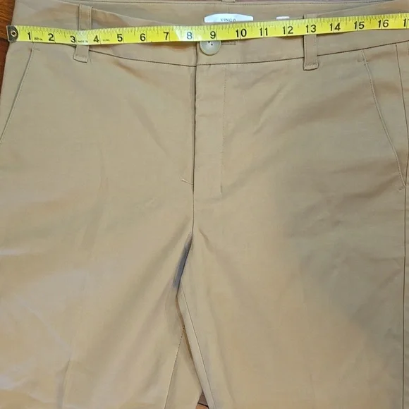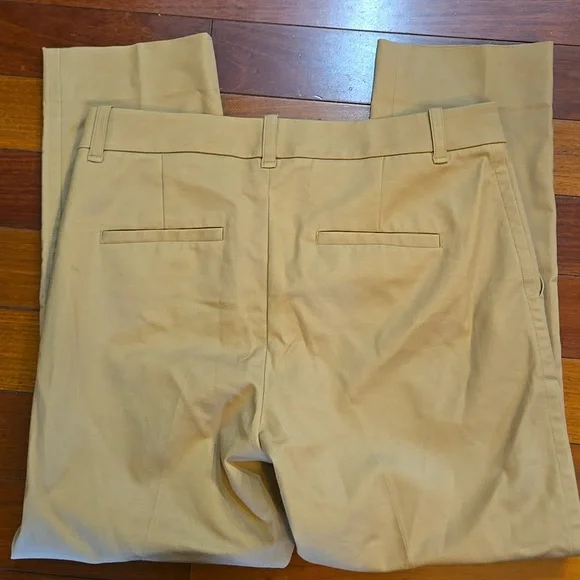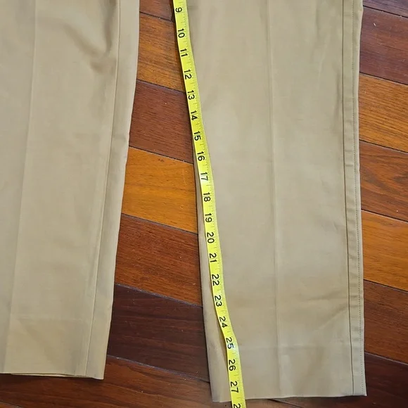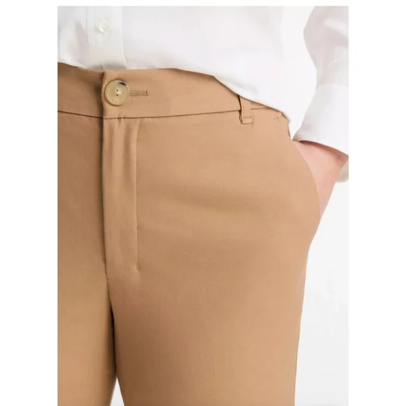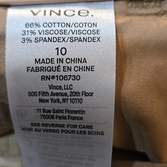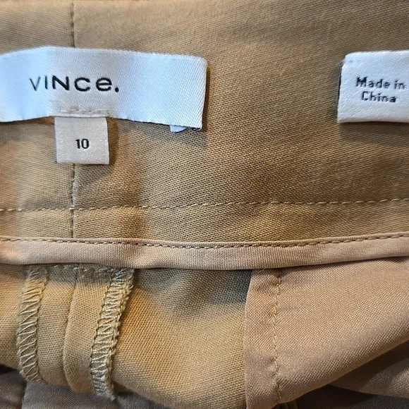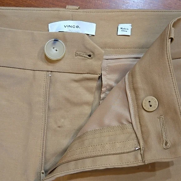 Vince Cigarette Trouser PantsA timeless essential, the Cigarette Trouser is crafted with a bi-stretch cotton blend for ease of movement and a perfectly smooth fit for a clean and cropped leg.•Faux horn button and zip closure. •Slant pockets.•Back welt pockets.•Hand wash cold. Line dry. Cool iron if needed. Or dry clean.•66% Cotton, 31% viscose, 3% spandex. Excellent condition. No signs of wear; may not have been wornMeasurements approximate,taken flat Color: Almond Brown TanSize: 10