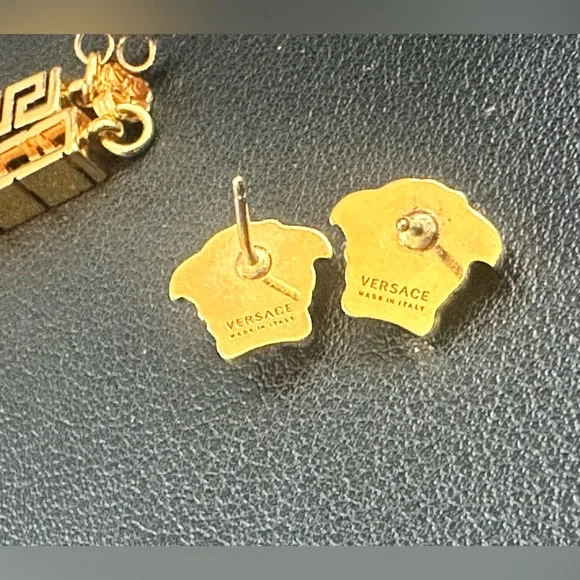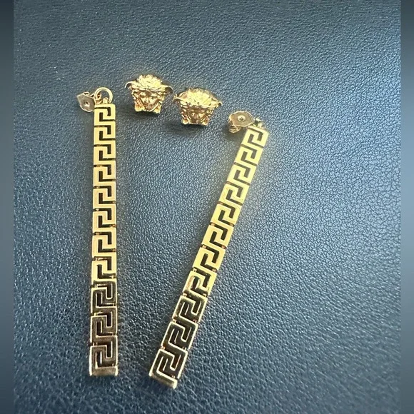 These Versace earrings showcase a stunning gold hue with a modern geometric drop design. The intricate chain-like pattern creates a sophisticated architectural look, enhanced by the play of light and shadow on the textured surface. Finished with simple stud attachments, these earrings are a luxurious addition to any ensemble.Brand new with tags! Can even be worn as Medusa head studs if you use a different backing! Pair of drop earrings in gold-tone brass.· Signature Medusa at face· Signature Greek key pattern at drop· Post-stud fastening· H2.75 x W0.5 Supplier Color: Versace goldGender: Womens