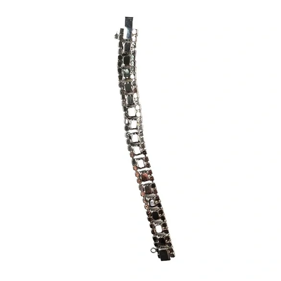 In excellent condition, all crystals are pronged set and in silver tone setting, has safety clasp. It is unsigned.