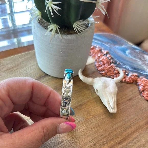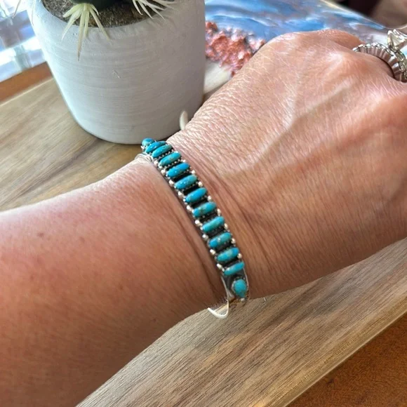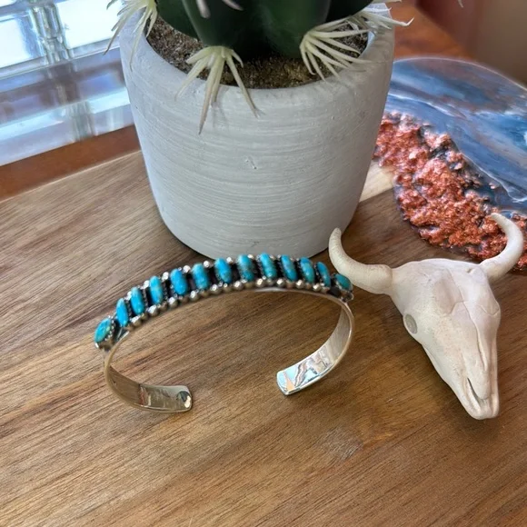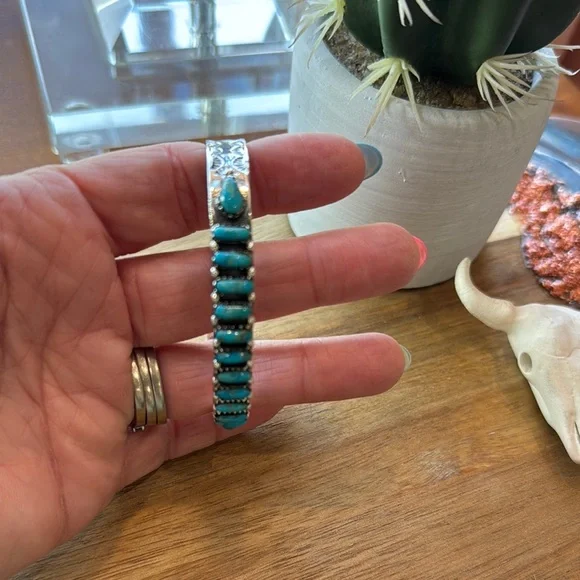 Elegant cuff bracelet featuring turquoise stones set in sterling silver. Perfect for adding a pop of style to any outfit.