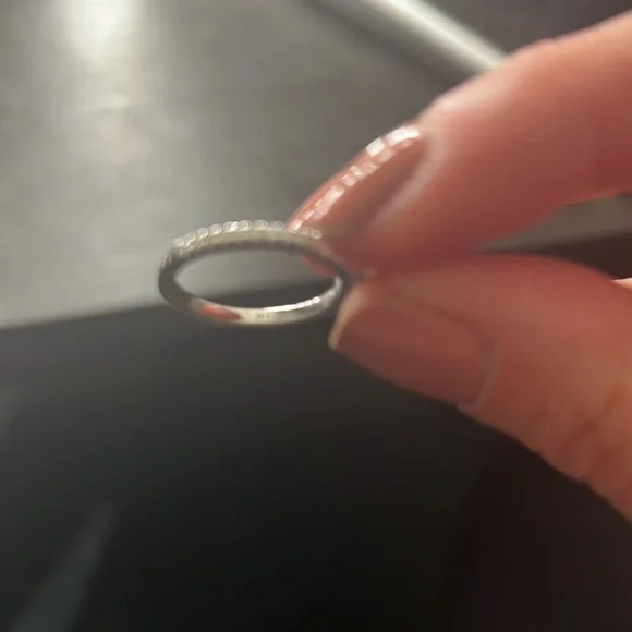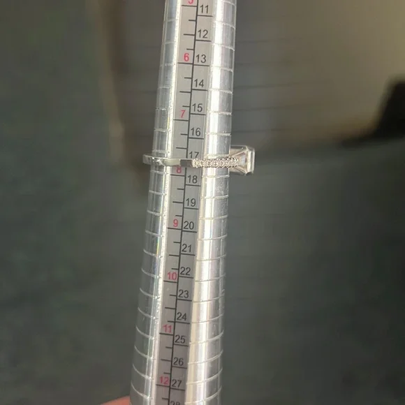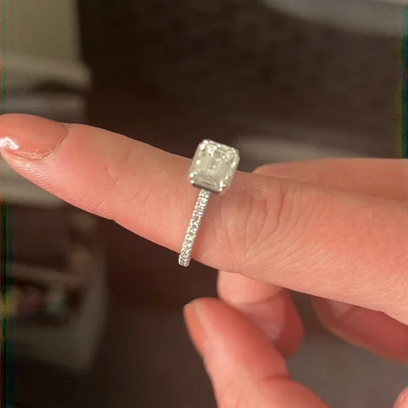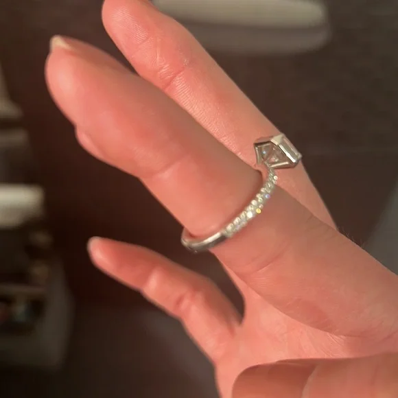 This is a gorgeous stamped 14k engagement ringMoissanite stones which sparkle like crazy Sideways emerald stone is super modern!Size 7 3/4Worn once !