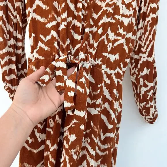 Cleobella Animal Print Belted Wide-Leg JumpsuitCondition: Excellent pre-owned conditionSize: S (small)Color: Brown, IvoryFeatures:•Striking animal print with earthy tones•Button-down front with a chic V-neckline•Billowy long sleeves with elastic cuffs for a tailored look•Self-tie waist belt for a cinched, flattering fit•Flowy wide-leg silhouette for effortless movement•Lightweight, breathable fabric perfect for year-round wearDescription:Make a statement in this Cleobella brown animal print jumpsuit, blending boho elegance with modern sophistication. Featuring a relaxed yet tailored fit, this piece boasts a button-up front, belted waist, and voluminous palazzo legs for a sleek, elongating effect. The billowy long sleeves with gathered cuffs add a romantic touch, while the lightweight fabric drapes beautifully. Perfect for a resort getaway, evening out, or effortlessly chic daytime look.