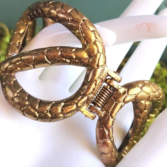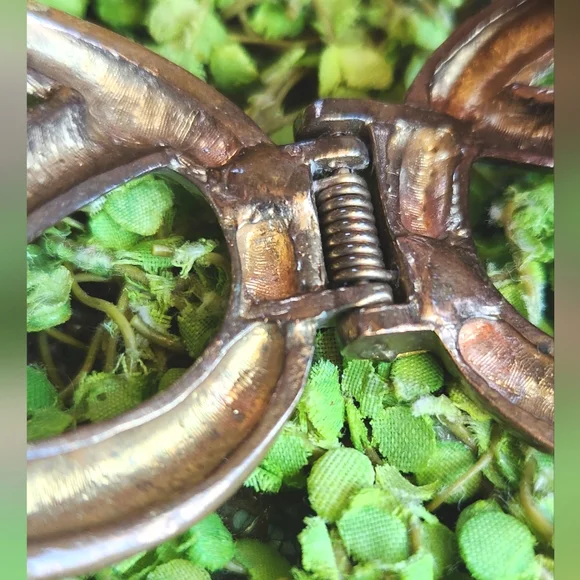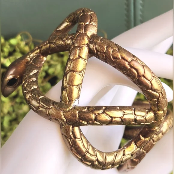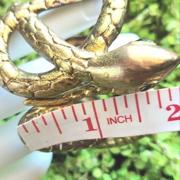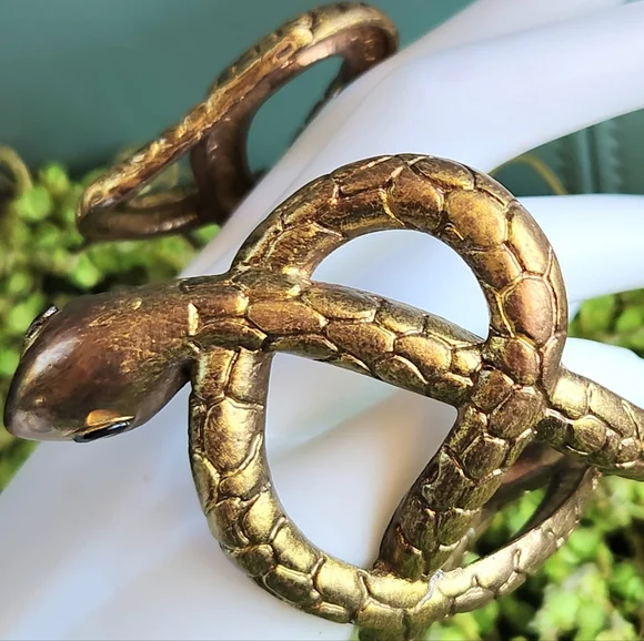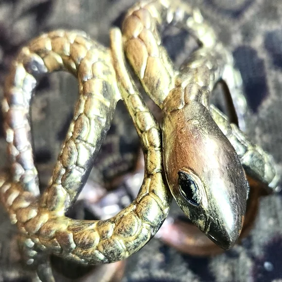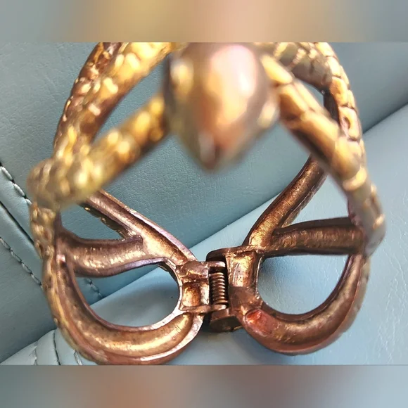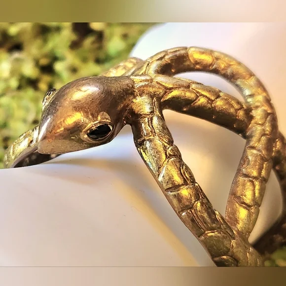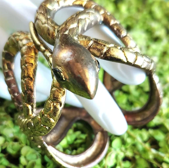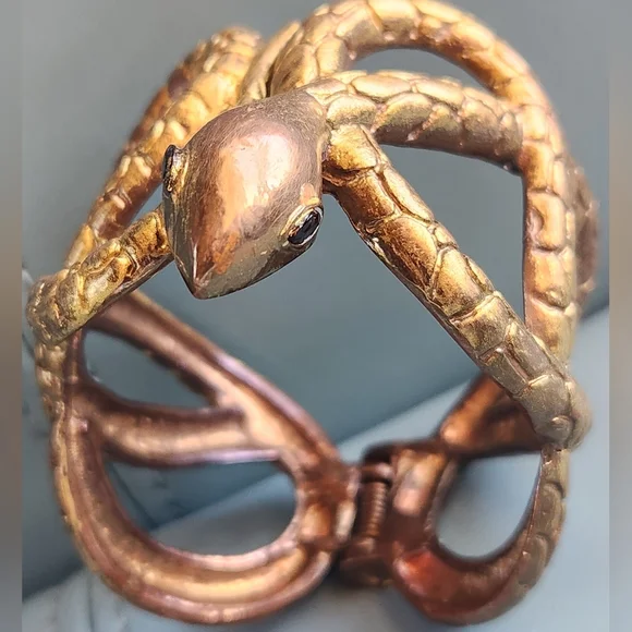Vintage 1970´s must have Handmade No MarkingSuper Unique & thoughtoutSNAKE retro Hippie FavoriteSerpent Coiled 2" wide braceletA weighty solid sturdy well sautered & thoughtout designMixed Metals HandcraftedDetailed Reptile Gold Copper Spring Closure Swirly Bracelet Unique Collectible Cuff Bangle Snake Viper Slither Wraps EUVC2 black stone eyedFits around wrist or can be pushed up to forearm depending on ones individual taste & size of arm●TOO small in diameter to go up on the upper forearm on most & have it close correctlyI like wearing these over solid colored sleeves for a different way to show her off!:)Please see all pictures & deets!CUFF IS appx 7" - 8"in overall diameterplease ask questionsTysm! SHIPS Now! Boxed w ♡....