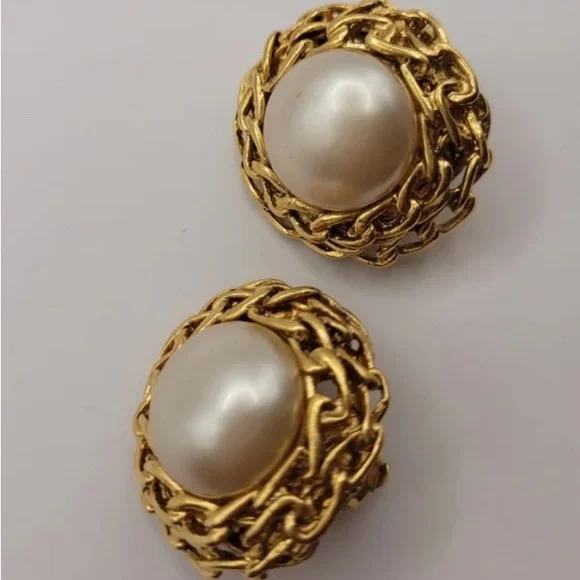 These exquisite earrings showcase a luxurious blend of gold and cream, featuring a circular design with a lustrous pearl at the center. The gold-toned metal is intricately woven, creating a textured, nest-like frame that exudes timeless elegance. Perfect for making a statement, these earrings combine classic charm with sophisticated craftsmanship.These earrings have wear consistent with time period vintage and also have the finest chip in one of the faux pearls.These are 3.2cm or 1.26in. These are from 1985 collection, worn twice.The chip is visible upon very close inspection but not when they are being worn.I have included a price break due to this minor imperfection.My description is accurate for what I see and know about this item and it may vary from yours. I hand pick and carefully research every special item that I post because I truly care about all of my customers. Please carefully review all of the photos and the description before you purchase this item. I can try my best to answer any additional questions that you may have about this item.All sales are final. Authenticity Guaranteed!Happy Shopping. Love Your Friend,Johnny Fashion