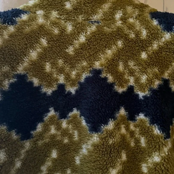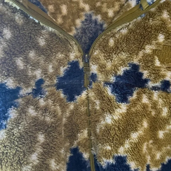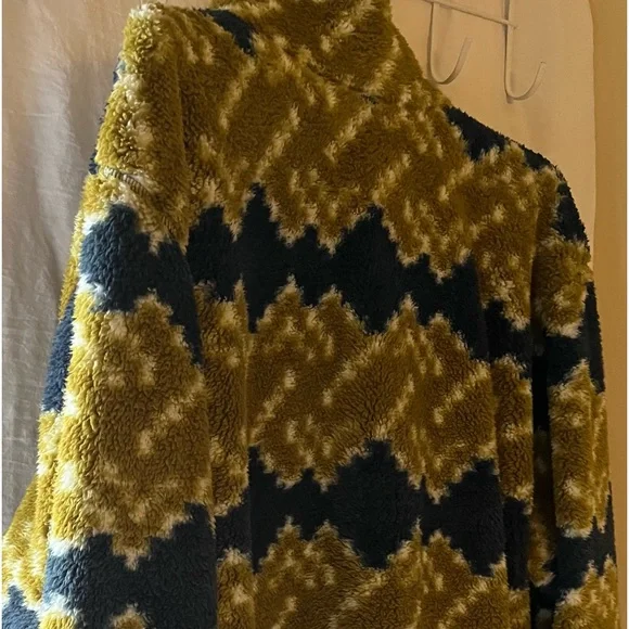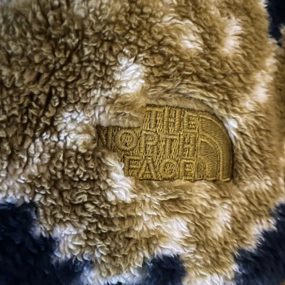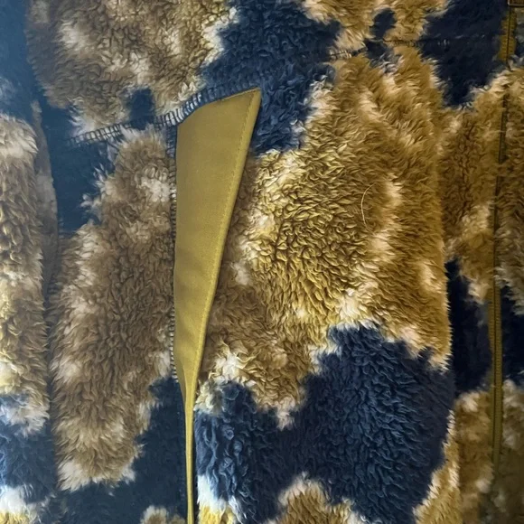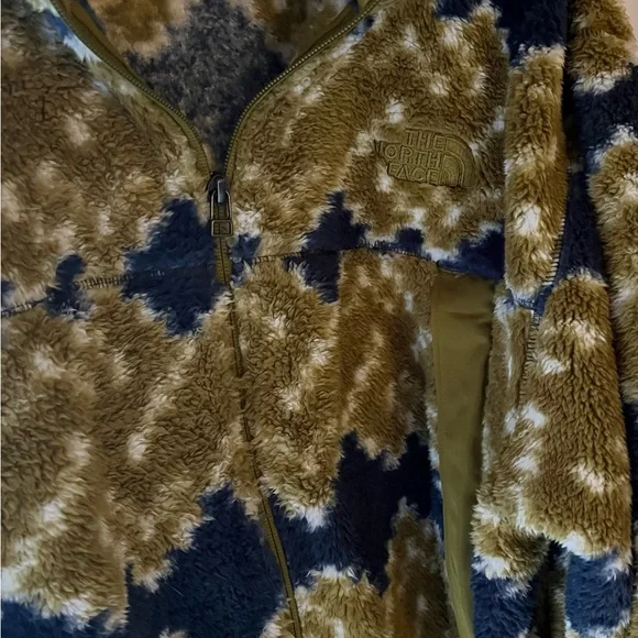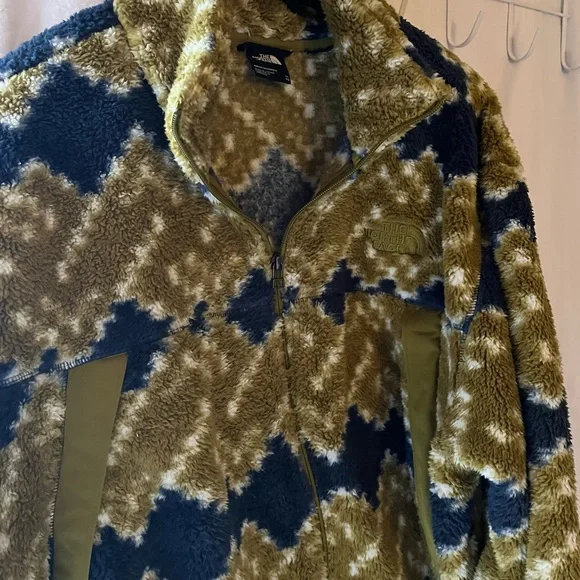 Super soft and comfy North Face Fleece full zip Jacket in Kiwi and Blue Printed Fleece.NWOT and in perfect condition.Jacket has kangaroo pockets with zippers.Pit to pit measurement is 26 inches measured flat.