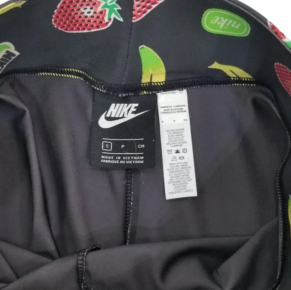 Perfect, like new condition Made from soft knit fabric, the Nike Sportswear Leggings feature a fun print for fresh, fruity style.~Fabric is soft and stretchy.~A high waist provides extra coverage and a lengthened look. ~Tight fit for a body-hugging feel ~Nike embroidered patch ~83% polyester, 17% spandex ~Machine washable Size Small Waist: 13" across Rise: 10.75"Inseam: 28"**Check my store for matching jacketPlease note: I have personally taken these photos and this is the actual item in my inventory. These are NOT stock photosIf you have any questions please feel free to contact me and I will get right back to you Stock#022722001280
