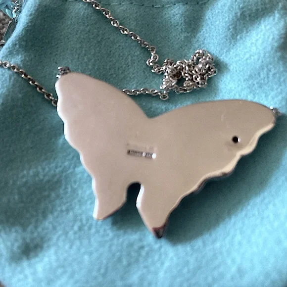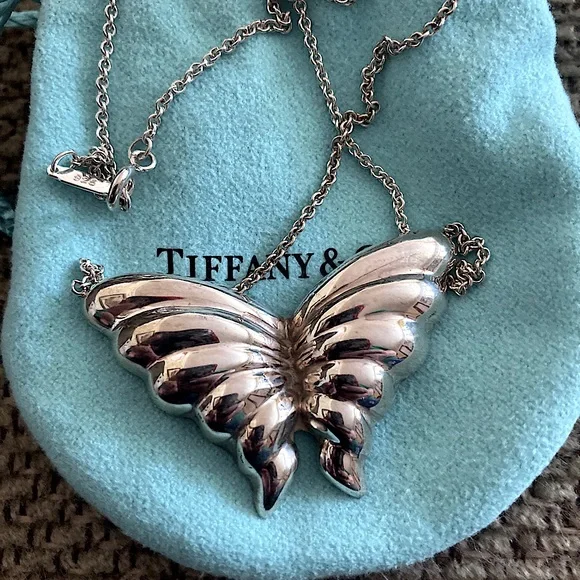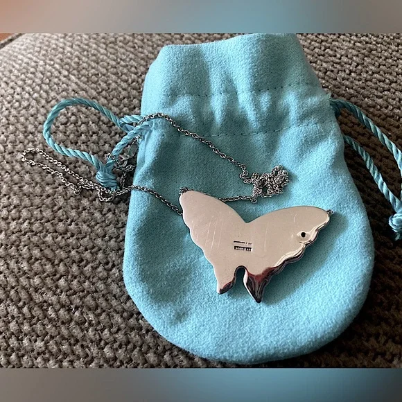Tiffany&Co rare to find if any , was original a brooch converter to necklace that is the reason for small opening in butterflyLarge butterfly necklace,925 silver comes with pouch...