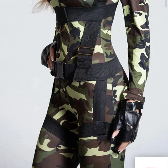 Pretty Paratrooper Costume by YANDY and leg Avenue The two-piece, Pretty Paratrooper costume includes a long sleeve, camouflage print body suit with a zipper front and black body harness with adjustable straps. (Gloves and Boots not included.)Color: Camouflage