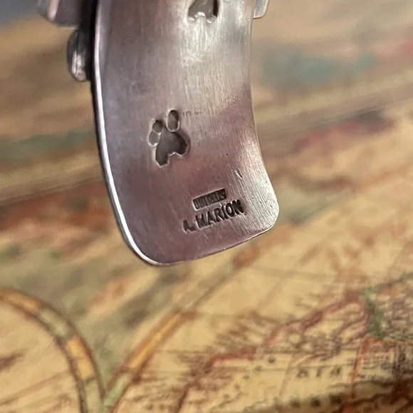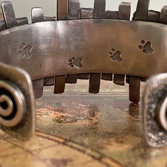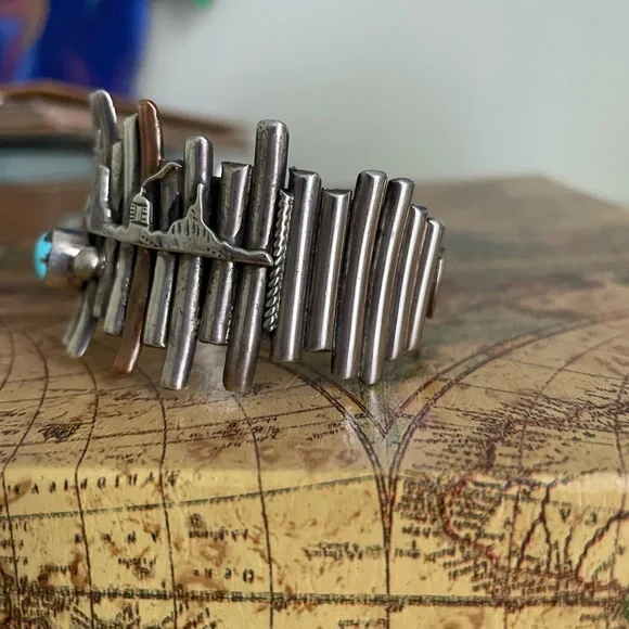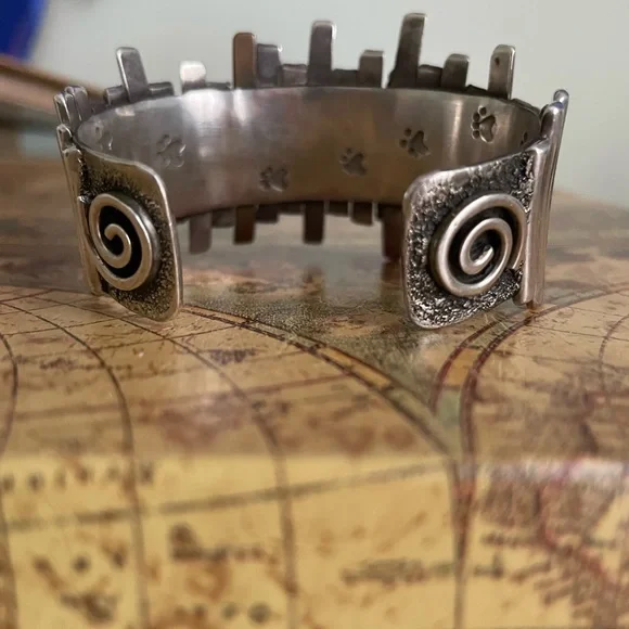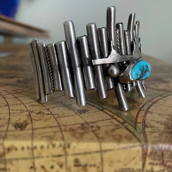 This artisan bracelet features a captivating blend of silver bars and a vibrant blue turquoise stone. The handcrafted design, with its fence-like pattern, adds a unique artistic flair. The organic shape of the turquoise beautifully contrasts with the geometric metalwork, making it a standout piece in any jewelry collection.note the Coyote paw prints on the inside-!This has One Mesa missing as you can see in the closeup -still Beautiful & is one of fav pieces