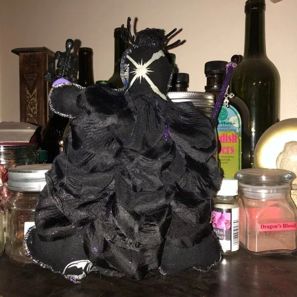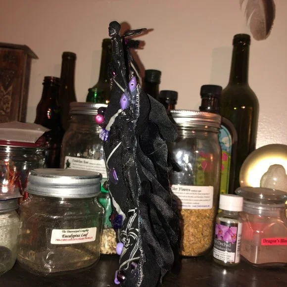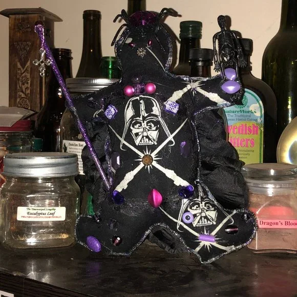 I´ve felt the desire to craft a Darth Vader Doll for sometime. I personally see Darth Vader as an egregore*, collectively we created him. He represents many things to people; dark wizard, left path magician, Lucifer and the list goes on. I will not tell you how to work with this doll. If you are drawn to it, then you will know. As with all my dolls it has been stuffed with herbs. I dressed it on my altar during the dark moon. *Egregore- Occult concept representing a "thought form" or "collective group mind", an autonomous psychic entity made up of, and influencing, the thoughts of a group of people. The symbolic relationship between an egregore and its group has beencompared to the most recent, non-occult concepts of the corporation and the meme.