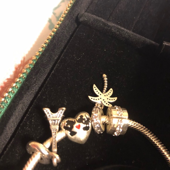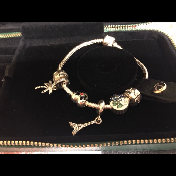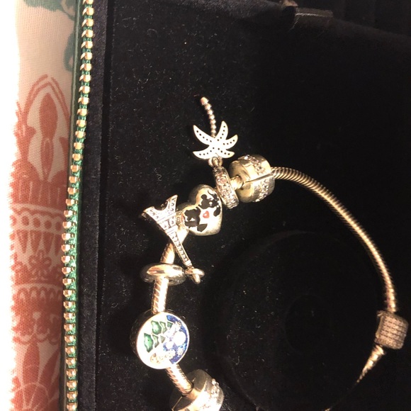 PANDORA Signature Clear CZ Bracelet With 2 Shining Path Clear CZ clip and Charms. Includes case.Never used. Passed return period.Color is SilverCharms include:Snowy Wonderland, Blue & Green EnamelEiffel TowerSparkling Palm Tree,Clear CZMinnie & Mickey Mouse Kiss Charm Sterling Silver