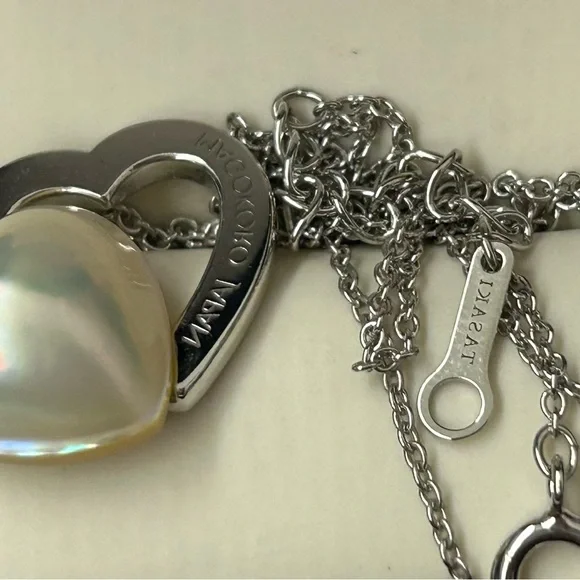 Sterling Silver Japan designer TaSaki mabe pearl Heart shaped pendant Necklace. Elegant necklace featuring a silver heart design with a stunning pearl accent. Perfect for adding a touch of sophistication to any outfit.