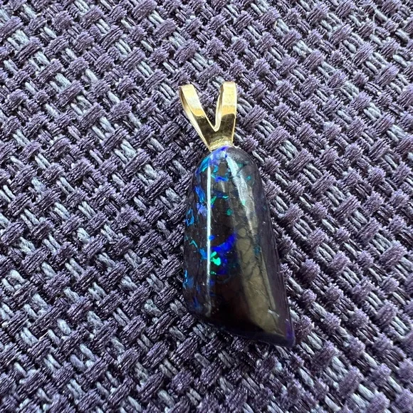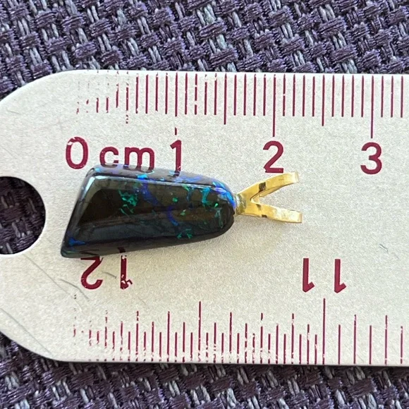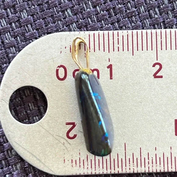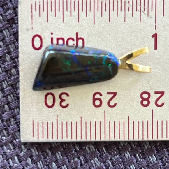 This is a very rare piece - one of a kind, to be precise! It was brought back in the late 70s from one of the Opal mines in Australia and a jeweler in Southern California added the 14k gold v-prong to allow it to hang as a pendant. It has been very well preserved, stored and cherished for the last 45 plus years! It is incredibly brilliant and the fires and lights within this opal’s black stone are extraordinary! Looking for a new home to continue the love and appreciation for such a rare specimen!!!The dimensions are shown in photos in both cm and inches. It is approx. 14 mm x 8 mm x 1.5 mm which means it is approximately 3-4 carat weight. Take a look around: similar size of a black opal from Australia can be upwards of $2,000-$5,000!!!