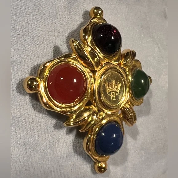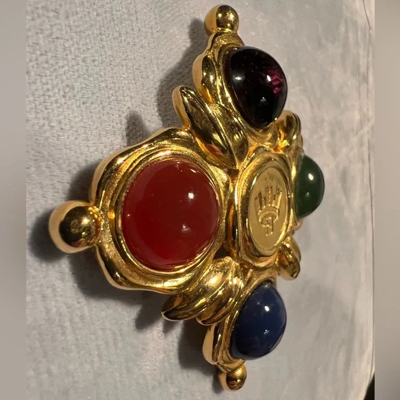 Vintage FENDI Bijoux Brooch with Sealing Wax motif. Circa 1992. Mint condition.Plated in polished 22kt gold with amethyst, dark green, lapis and carnelian German glass cabochons....