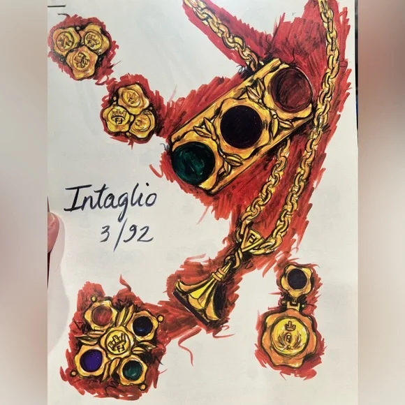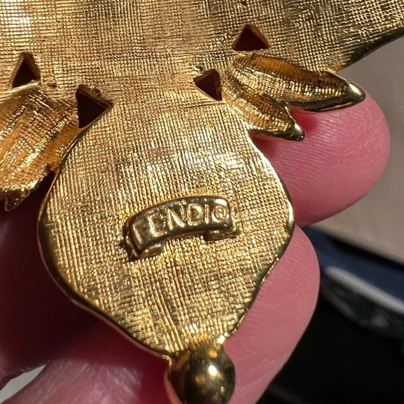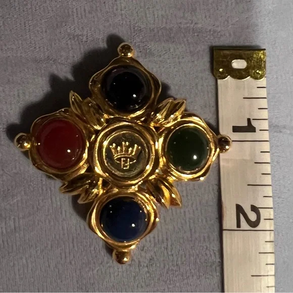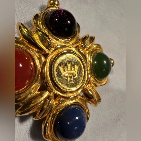 Vintage FENDI Bijoux Brooch with Sealing Wax motif. Circa 1992. Mint condition.Plated in polished 22kt gold with amethyst, dark green, lapis and carnelian German glass cabochons. FF Logo on the center “seal” and signed logo on the back. Pin mechanism in perfect condition.See last photo for image of the original sales sheet drawing. One owner - see matching clip earrings in my closet!