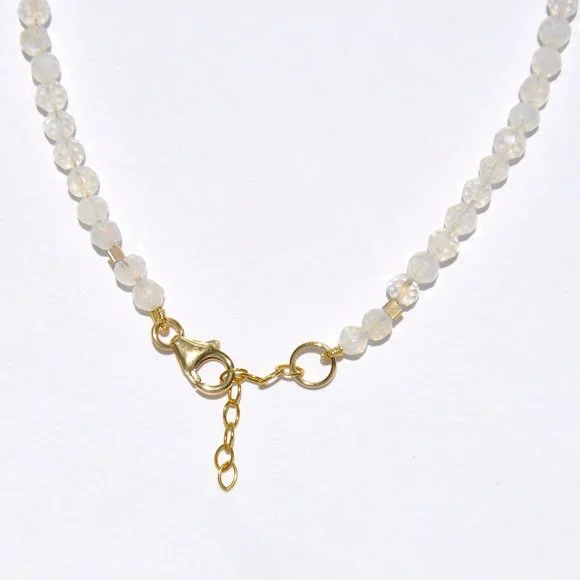 Sterling Silver and 14kGold Filled Moonstone & Diamond Leaf Necklace* Natural Faceted Moonstone Stone (4mm approx.) Necklace* Black Rhodium 925 Silver Leaf Pendant with diamonds* 100% Natural Rose Cut Diamonds - 23ct* 14K Gold Filled clasp closure Will not tarnish)* Total Length. 18.5" with extender included