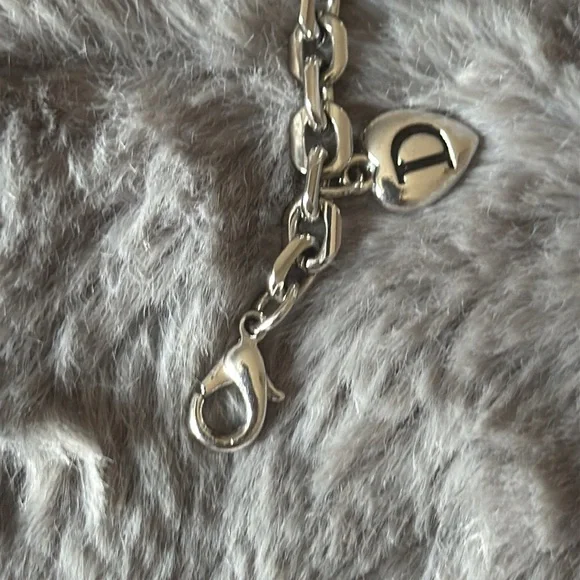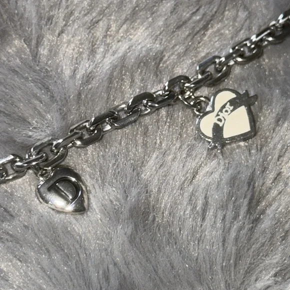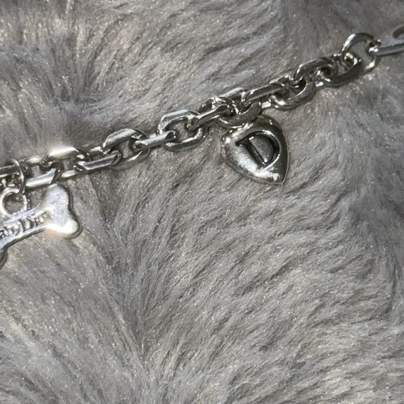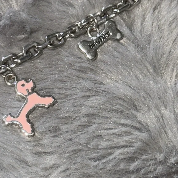 Preloved Christian Dior Stylish silver charm bracelet featuring a pink dog charm. Perfect for adding a playful touch to any outfit. Comes with box