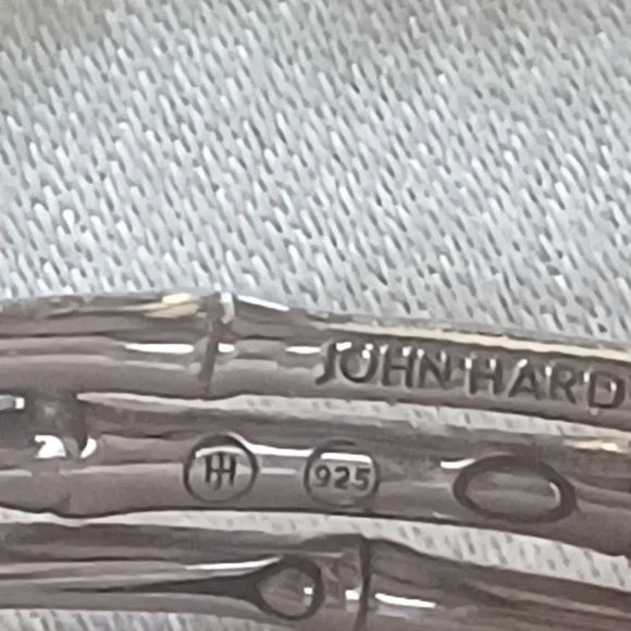 Lovely John Hardy Bamboo Cuff Bracelet is a great piece to wear with anything. Classic John Hardy Bamboo design in Sterling Silver. This cuff is a size Medium but can be pinched tighter if needed. Inside is stamped John Hardy, JH, 925 and M. It also says This planted 2 Bamboos. This is in very good pre-owned condition with very light scratching.