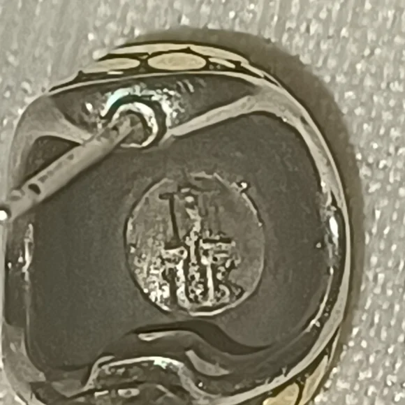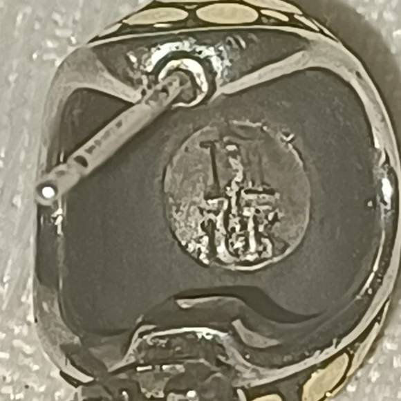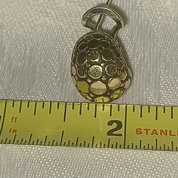 John Hardy Sterling Silver and 18k Buddah Belly Huggie Hoops are a great pair of earrings that go with everything. These are from the Dot Collection and are 18k and sterling silver. These have sterling posts with an omega back closure. They are half an inch long and about 3/8 inch wide. They are stamped on the inside with JH and 18k and the Omega closures have 925. These are in very good pre-owned condition with some light scratching.