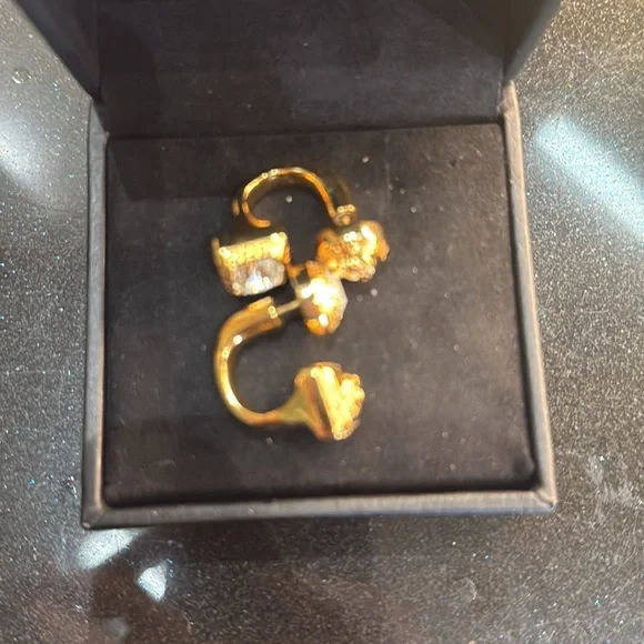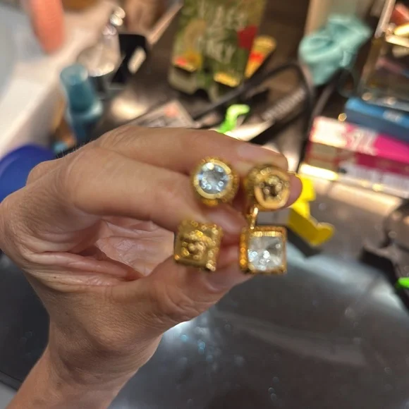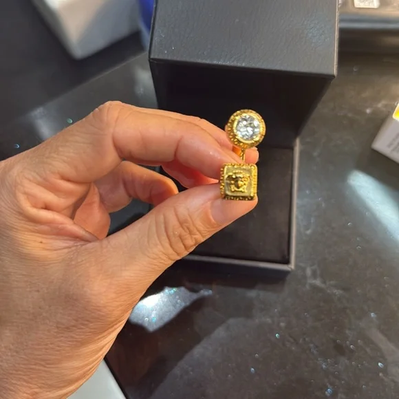 These stunning Versace earrings feature a modern geometric design with a luxurious gold finish. The double-drop style showcases a circular top and a square bottom, both adorned with clear stone embellishments and intricate metallic detailing. Perfect for adding a touch of elegance and sophistication to any ensemble.This style is sold out in stores and stunning and eye catching.