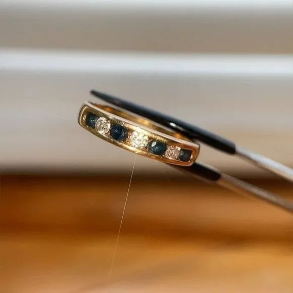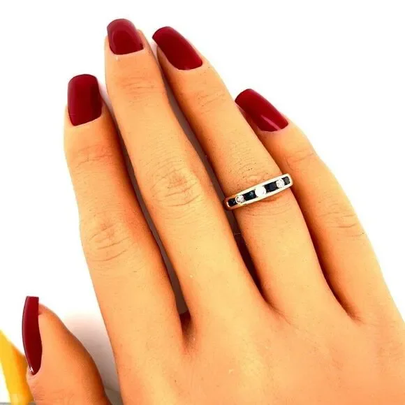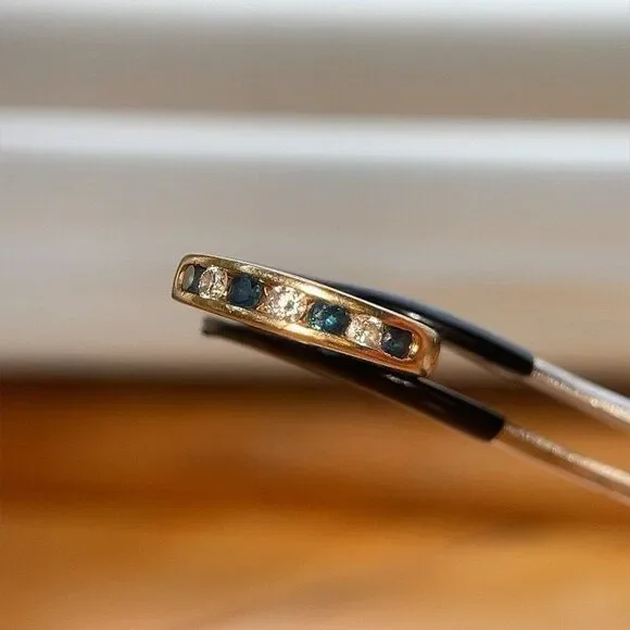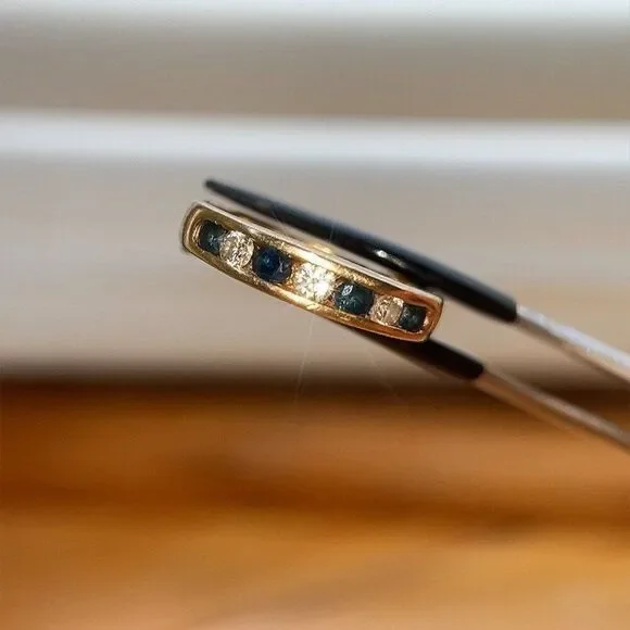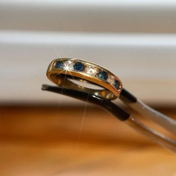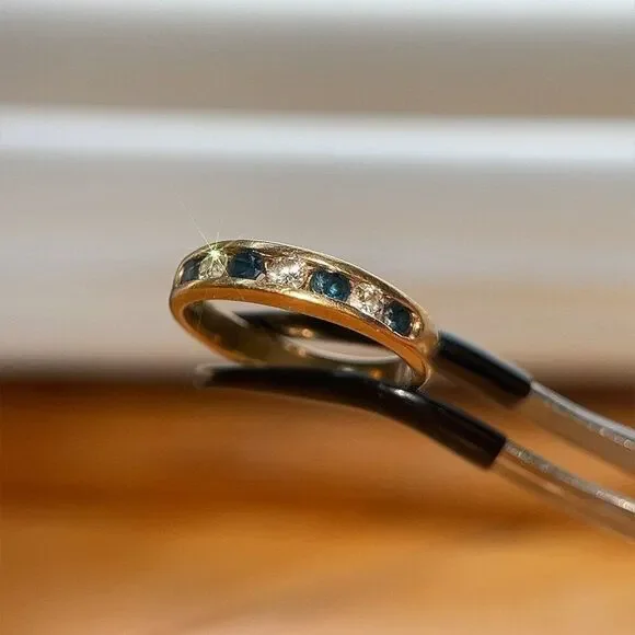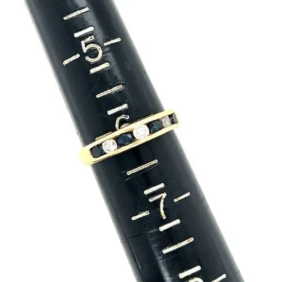 SPECIFICATIONS:Metal/Gold Karat: 14k Yellow GoldMetal Stamp: 14KSize: 6Band Thickness: 4mm front, 3mm back approximatelyGem: Blue Sapphires and DiamondsWeight: 2.9gCondition: PreownedReal 14k Yellow Gold Diamond and Blue Sapphire Band Ring, NOT GOLD PLATED OR GOLD FILLED.Note: Pictures are enlarged to show fine details of the product.