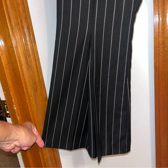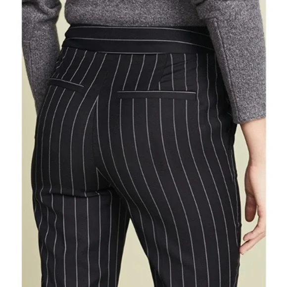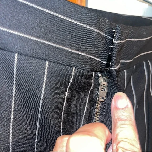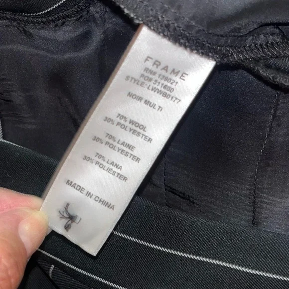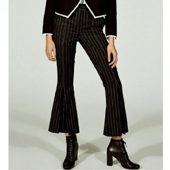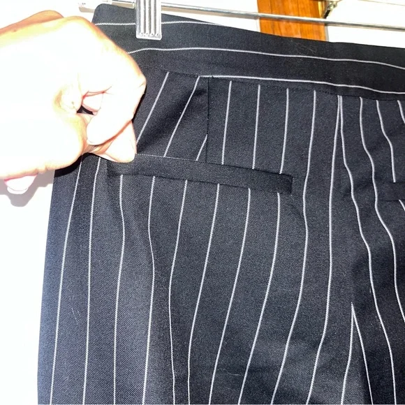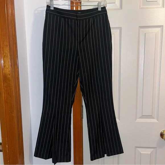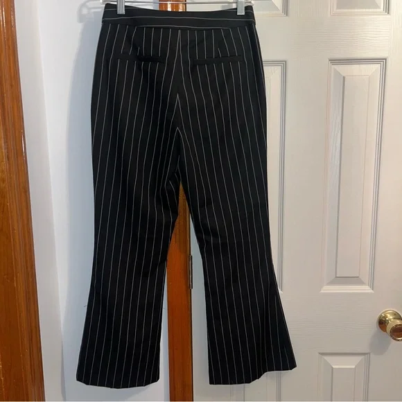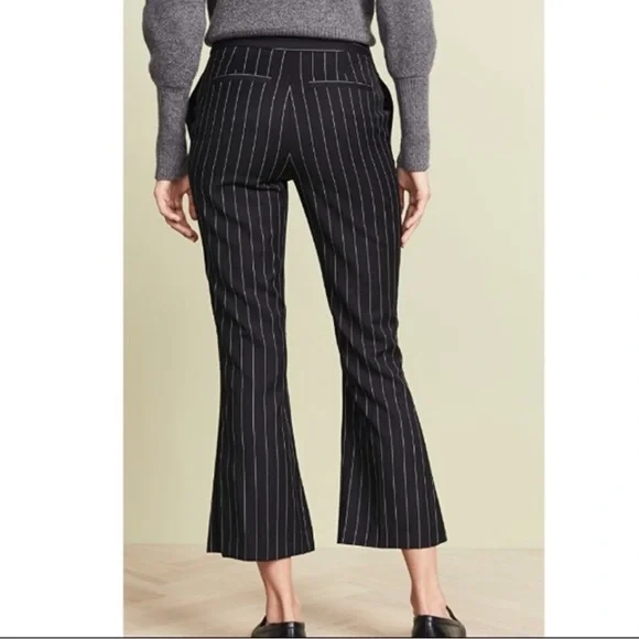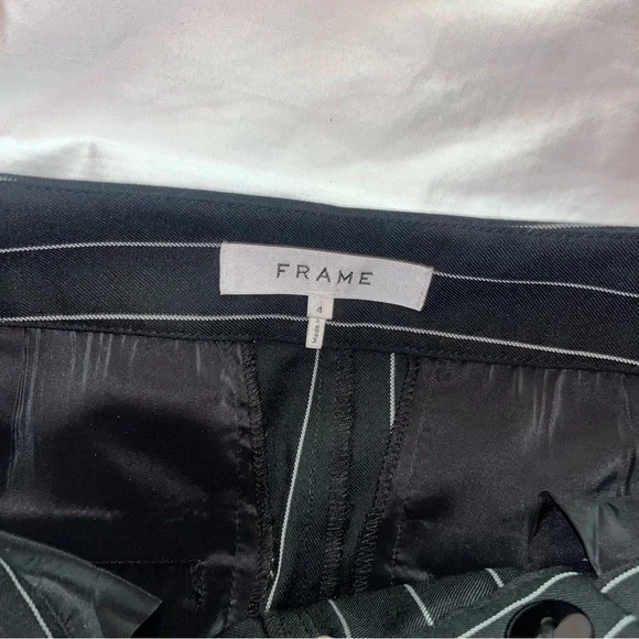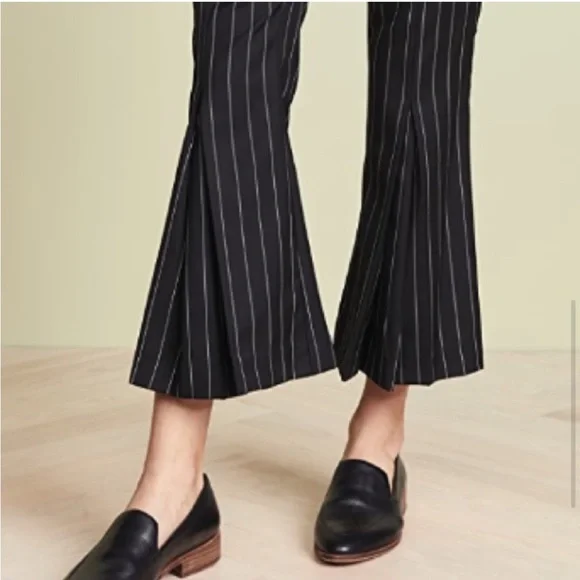 Frame Noir Wool Suiting Pleated Flared Kick Crop Pinstripe Pants. 70% Wool & 30% Polyester; Lightweight Year-round fabric. Zipper and Hidden Hook Front Closure. Two Side Seam Front Hip Pockets & Two Back, functional Slit Pockets. ( still stitched closed ) So Versatile… Dress Up or down. ChicPerfect Condition Flat Lay Measurements: Waist - 14.5”Rise- 11”Inseam - 27”