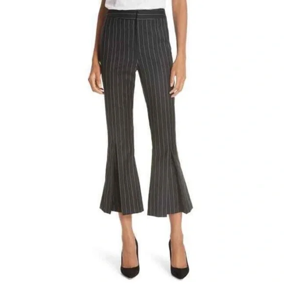 Frame Noir Wool Suiting Pleated Flared Kick Crop Pinstripe Pants. 70% Wool & 30% Polyester; Lightweight Year-round fabric. Zipper and Hidden Hook Front Closure. Two Side Seam...