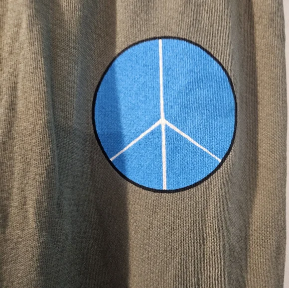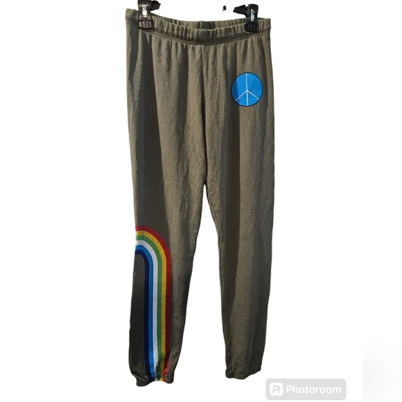 Sold Out Everywhere! I have these joggers and I LOVE! The colors are vibrant which add to the already universal signs that are handpainted on them- from the beautiful blue peace symbol on the upper front to the rainbow that spreads from the front to the back on one leg, these are unique, comfortable and just plain nice! L: about 39.5 in.P: about 14.5 in. 100% Cotton ***no care tag, but I own these, as well- they are 100% Cotton I video item to prevent fraud Read my bio b4 purchase