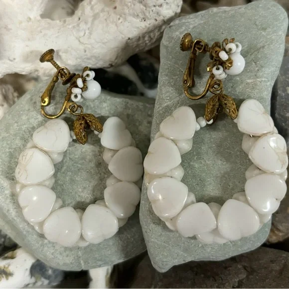 These Vintage Signed Miriam Haskell Heart Hoop Clip Earrings are a stylish addition to any woman´s jewelry collection. Made in the United States during the Retro era (1935-1950), these earrings showcase a classic hoop style with a charming heart design. The elegant white color and clip-on closure make them perfect for a birthday occasion or any fashionable look. Signed by the renowned brand Miriam Haskell, these earrings exude vintage charm and sophistication, ideal for those who appreciate unique and original pieces of fashion jewelry.Brand: Miriam HaskellColor: whiteCondition: excellent Vintage: YesLength: 2”Signed: yes