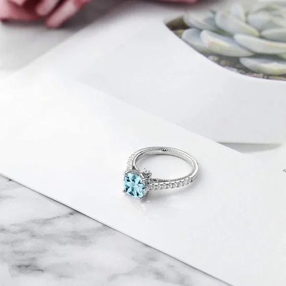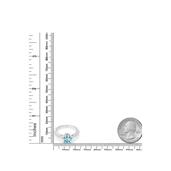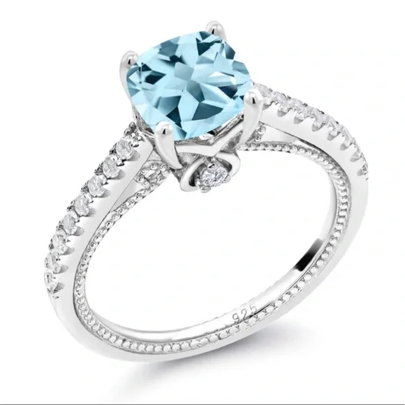 Gorgeous Cushion Cut Luxurious Sky Blue Topaz and White Sapphire Ring. Show stopping cathedral setting & vintage mill grain detailing.* 2.30 cttw Cushion-Cut Sparkling Natural Swiss Blue Topaz * VS clarity, measures 7mm* Round Cut White Sapphires * Glamorous 4.12 cttw* White Gold Plated* Elegant 925 Sterling Silver Hallmark StampNWOT. High polish Finish. All measurements are approximate.