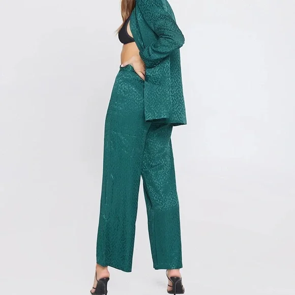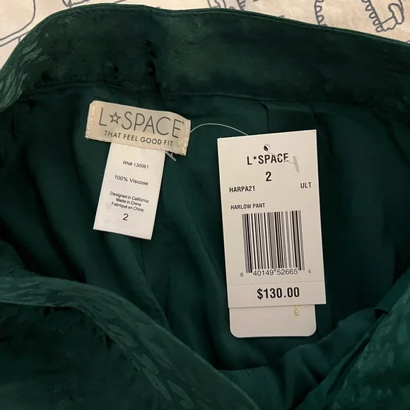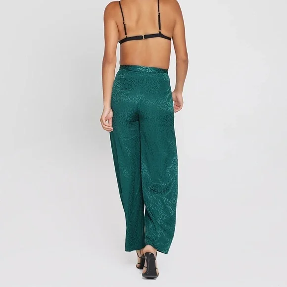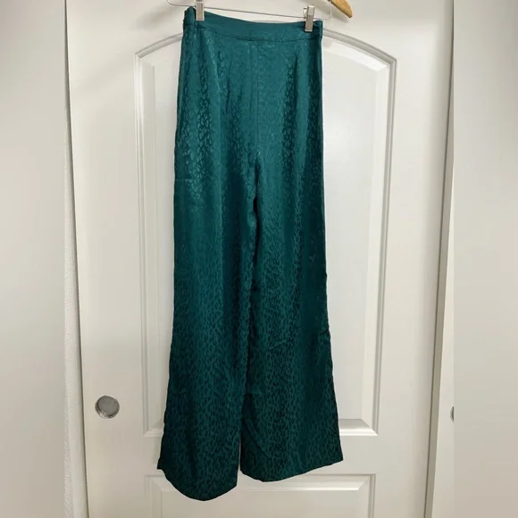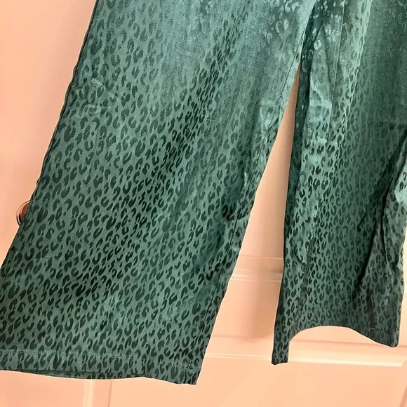 New with tagL Space Leopard Harlow Wide Leg Pant in UltramarineSize 2 Gorgeous green animal print patternWide legLightweightSide zip closure Approximate measurments flat: 12" waist / 11.5" rise / 28.5" inseam Like it? Make an offer! Bundle with other items in my closet to save on shipping.