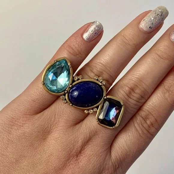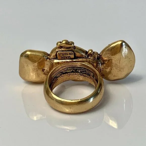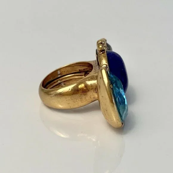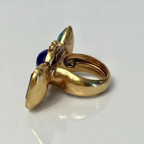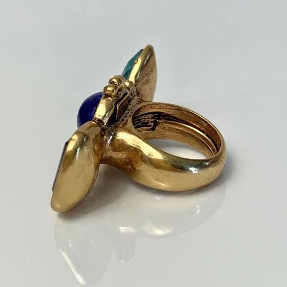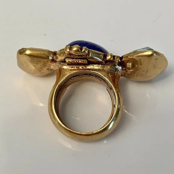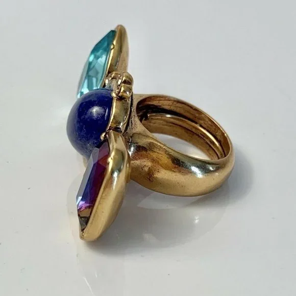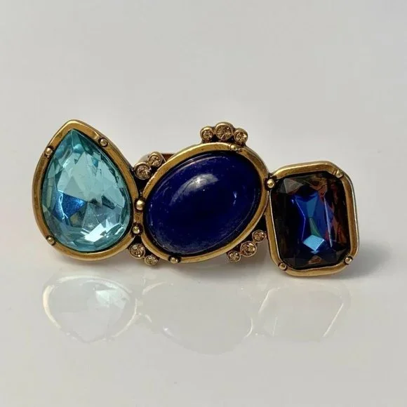 Oscar de la Renta Signed 3-Crystal Ring AdjustableSize 7-8A rich, antiqued finish gives this sculptural Oscar de la Renta cocktail ring an ornate edge. Ring sizer inset.Sculptural design with goldplated finish24k goldplated brassPewter, brassCustom resin cabochon center, emerald-cut blue crystal, and iridescent teardrop crystalWide band.3"W x 1 3/4"H.Made in USA.#0036#51:49