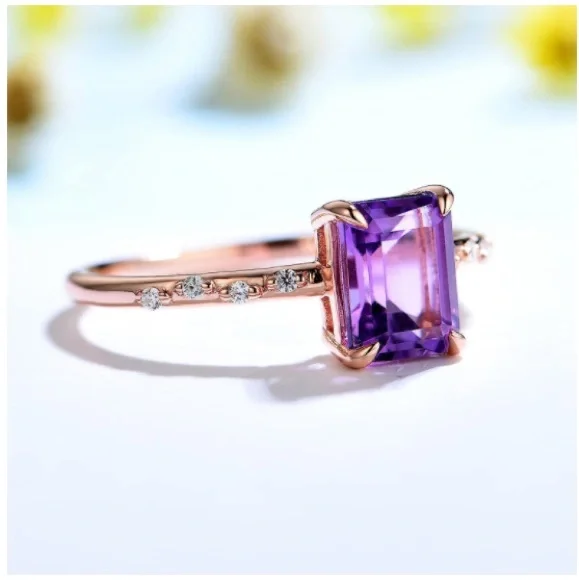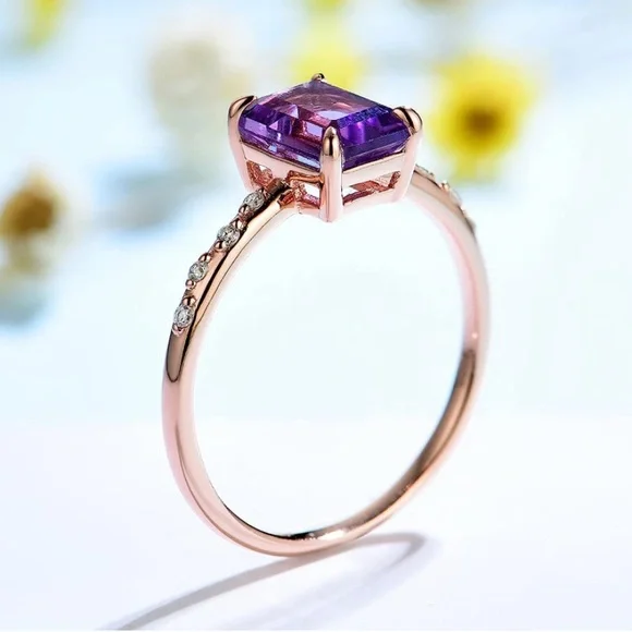 2 carat Natural Amethyst Diamond Moissanite Ring NWOT Beautiful dainty elegant band with a perfect emerald cut purple amethyst 14k Rose Gold or 14k White Gold over 925 Sterling Silver * 2 carat (6 x 8 mm) Emerald Cut Natural Amethyst* 1/4 cttw Accent Pave Set White Diamond Moissanites* Tests positive for diamondMeasurements are approximateRelated: birth stone crown chakra rainbow blue purple red crystal healing effect Gemini fire flash gemstone fine jewelry mercury light multi multicolored color change pale moon rare strong magic zodiac enchanted jewelry gift present for wife girlfriend fiancé special occasion date night fine jewelry diamonds sparkly moissanite valentines birthday anniversary present size ring engagement wedding Alexandrite emerald baguette vintage antique estate retro classic career chic gold silver rose gold matte 925 precious metals luxe Cartier levian Louis Vuitton certified Disney Disney treasures expensive luxury rare designer beautiful gorgeous elegant boho minimalist gypsy distressed metallic embellished graduation bridal chunky
