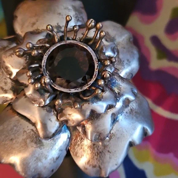 This elegant silver floral cuffadds a touch of whimsical amusement to almost every outfit. The center of the silver flower is a luscious brown topaz.It has an adjustable back as...