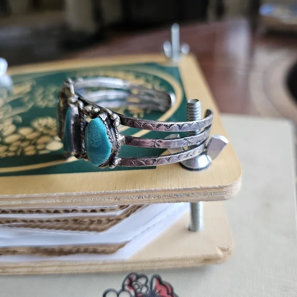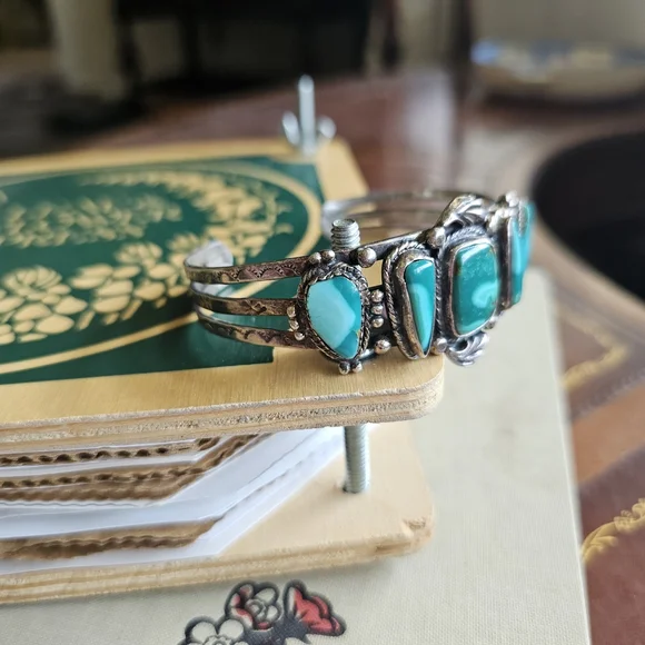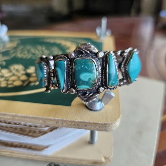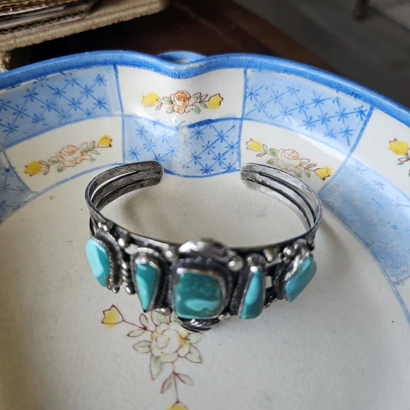 gorgeous hand made vintage sterling silver and turquoise bracelet. 5 stones most likely Royston turquoise but I cannot be sure.about 7in around including the gap.It´s so...
