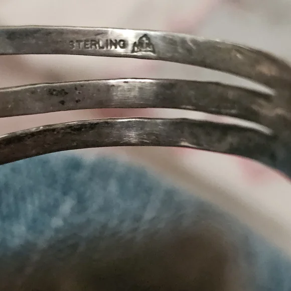 gorgeous hand made vintage sterling silver and turquoise bracelet. 5 stones most likely Royston turquoise but I cannot be sure.about 7in around including the gap.It´s so beautiful! stamped sterling
